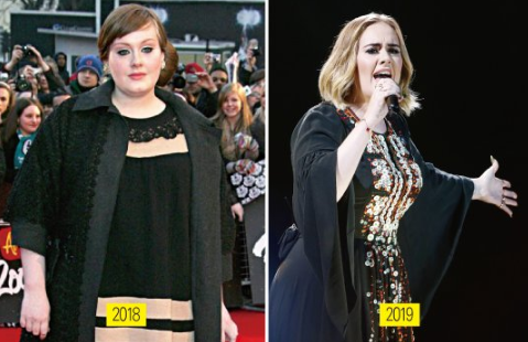 위 사진이 아델의 다이어트 전후 사진입니다. 2018년과 2019년 1년 사이 전혀 다른 사람이 되었죠.